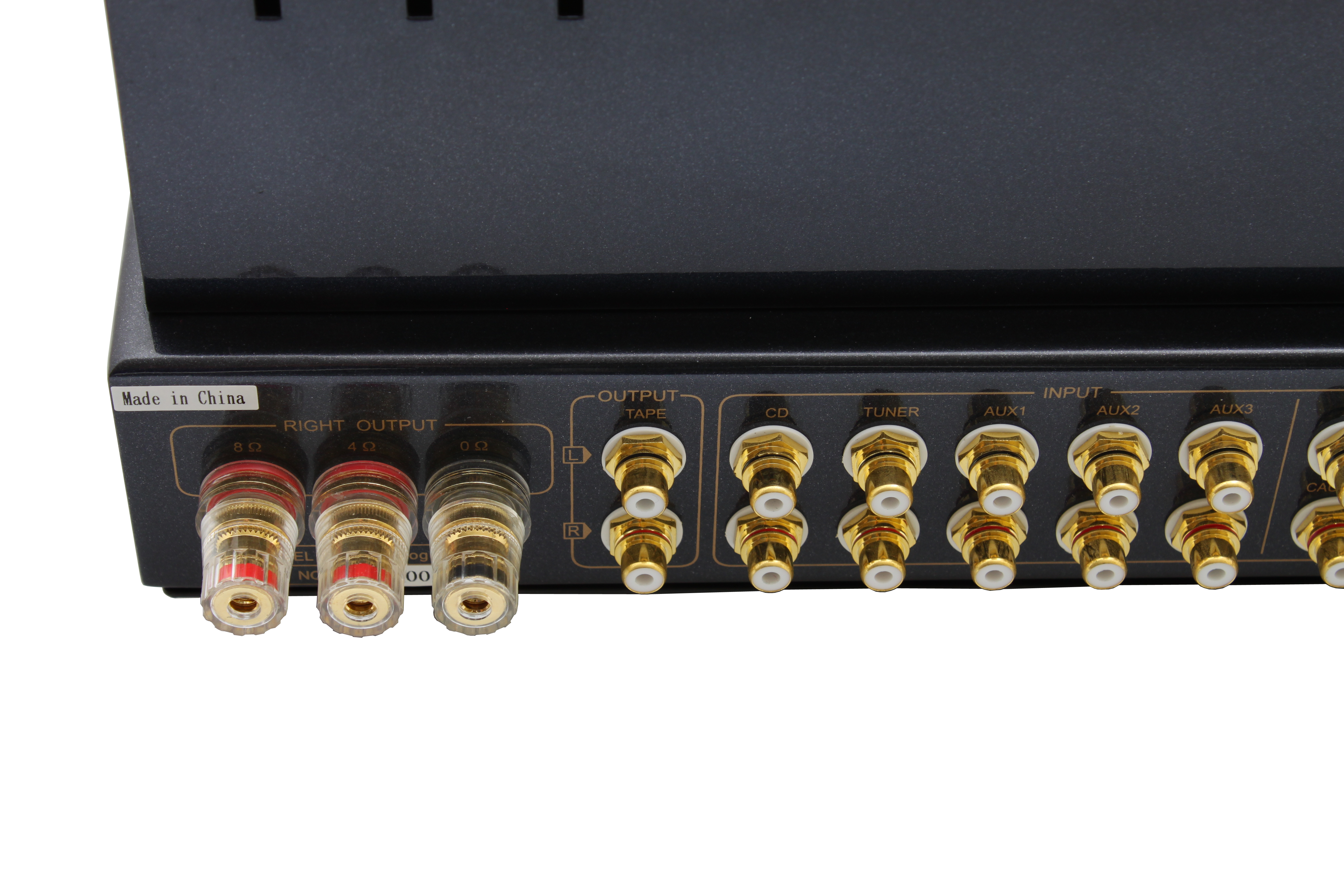 The DiaLogue One features five line-level inputs (labelled CD, Tuner, Aux1, Aux2, and Aux3). A sixth input, labelled HT, is a home theatre pass through. This is useful for hybrid home theatre/stereo systems, where one uses a system as usual when listening in stereo but uses a receiver or other surround sound processor when watching movies. In the latter mode, the front left and right channels are driven by the DiaLogue One and the other channels are powered by other amplifiers. With a home theatre pass through, the signal integrity of the the stereo signal isn’t compromised by passing it through a surround sound processor. Unlike its ProLogue counterpart, the DiaLogue One also sports a pair of RCA output sockets to facilitate connection to a tape deck or other recording device.