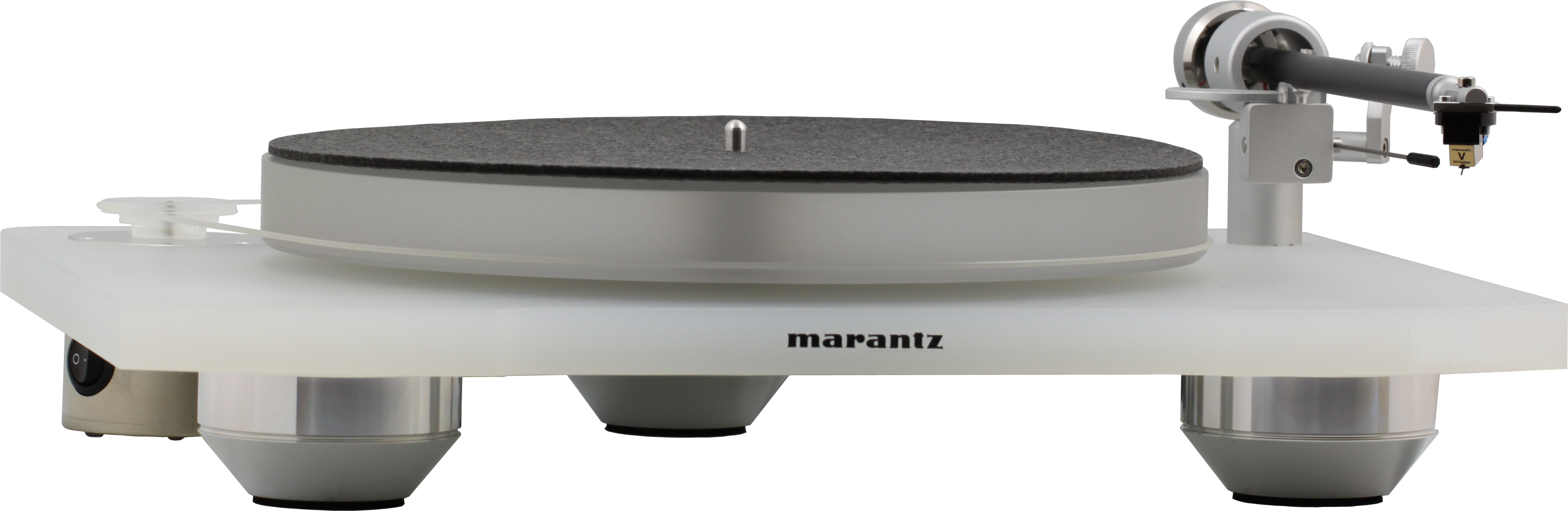 A joint development between Marantz by Clearaudio (and manufactured by the latter for Marantz in Germany), the TT-15S1 could be likened to a Clearaudio Emotion on steroids. It features a 20 mm thick satin white acrylic plinth, which is supported by three large polished aluminum feet. With the exception of felt pads on the bottom of its feet, the TT-15S1 has no suspension so it should be placed on a fairly well isolated platform, especially on suspended wooden floors.